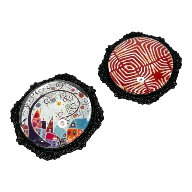 Magnifique broche noire avec cabochon imprimé, modèle au choix, de 4 cm environ. Poids 15g.