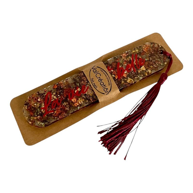 Un joli marque page à pompon avec inscription "La vie est belle", en résine époxy, un cadeau original à offrir à une personne qui aime la lecture.
