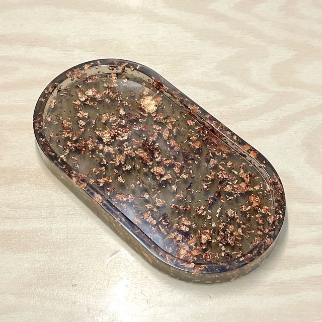 Magnifique plateau de forme allongé avec rebord en résine époxy, de 18x9,5 cm & épaisseur 1,8 cm environ.