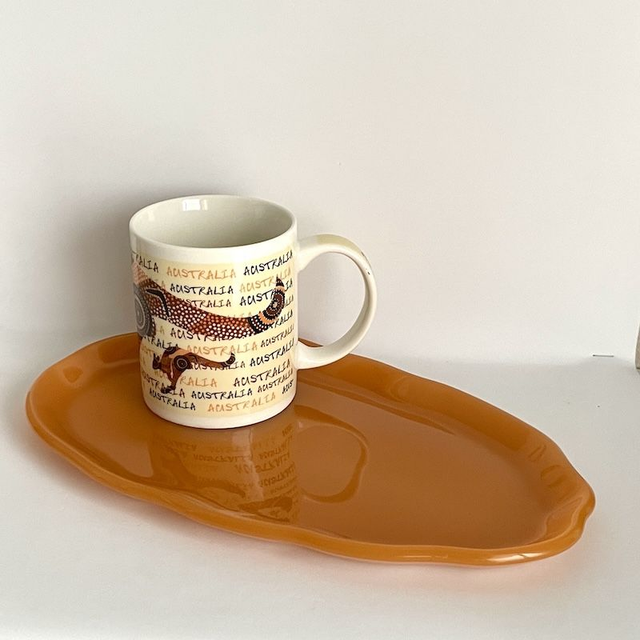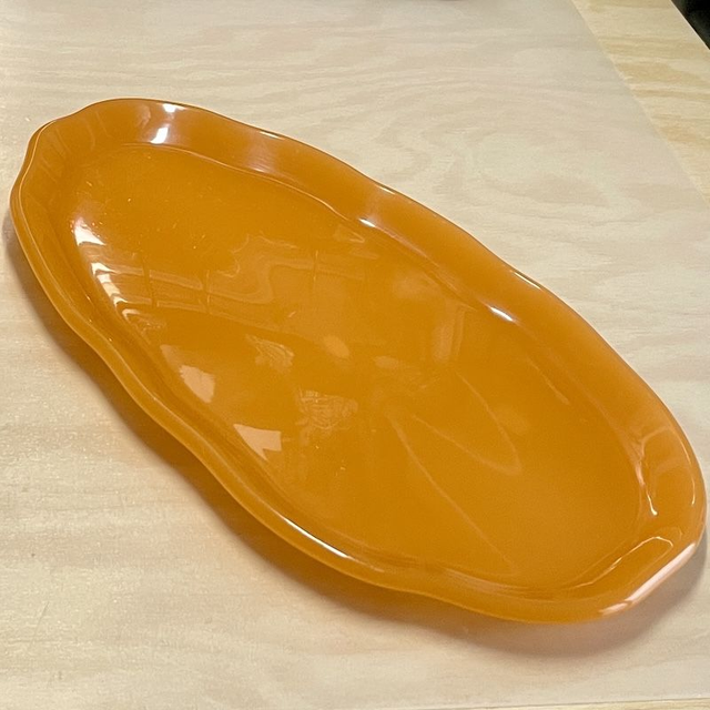 Magnifique plateau vague allongé, à rebord de couleur Ocre en résine époxy, de 28x17 cm & épaisseur 1,6 cm environ.
