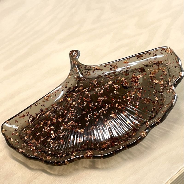 Magnifique vide-poche feuille de Ginkgo en résine époxy, de 18x14 cm environ.