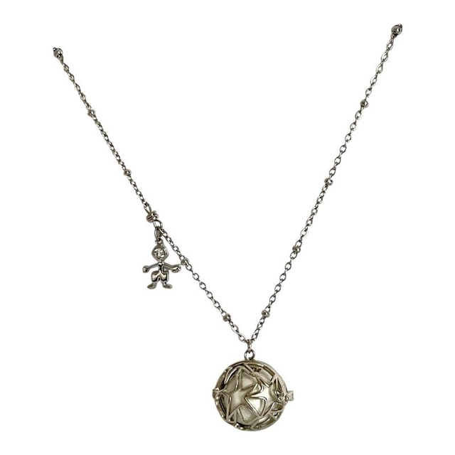 Magnifique Bola de grossesse "BABY BOY" en acier inoxydable couleur argent, sur chaine 95 cm et pendentif 2 cm environ. Poids du bijou 16g.