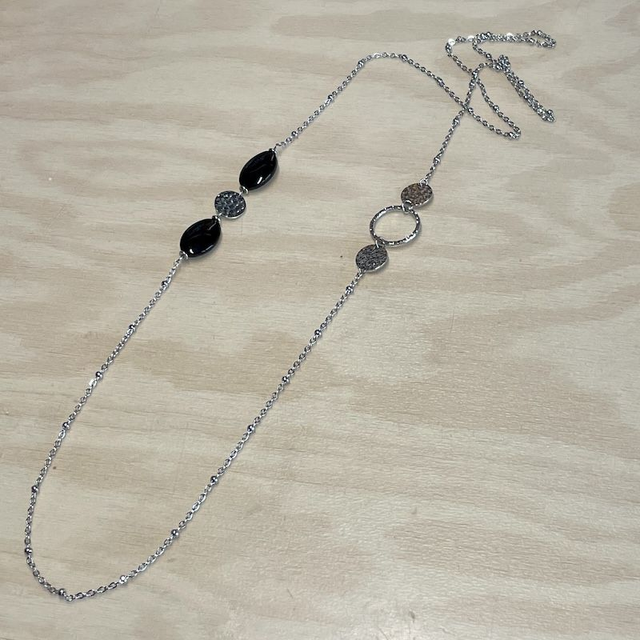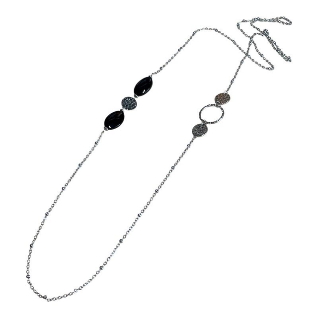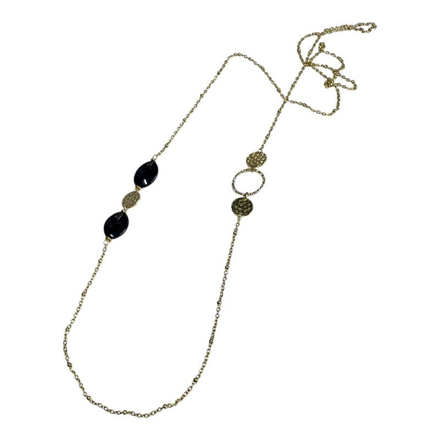 Magnifique sautoir en acier inoxydable doré ou argenté. Véritables Agates noires, perles naturelles et acier. Chaine de 95 cm environ. Poids 15g.